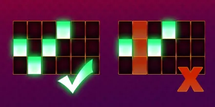 On the first box with six reels, you can see the winning combinations. The same symbol was hit on four adjacent reels. On the second box marked with a red cross, there is a losing combination. The green symbol was hit on a first, third and fourth reel but not on the second. This breaks the line of matching symbols.